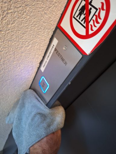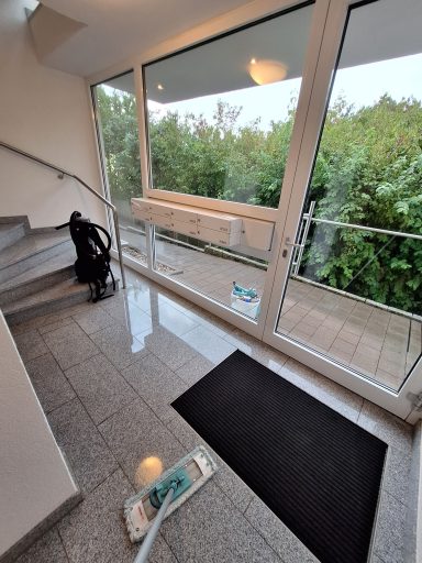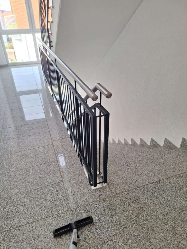 Böden saugen, Fliesensockel absaugen, Spinnen und Spinnennetze einsaugen, Fußabtretersysteme entnehmen aus- und absaugen, Fahrstuhltürrinnen saugen, Böden wischen, Handläufe, Treppengeländer, Lampenschirme, Lichtschalter, Türklingeln, Fahrstuhlarmaturen innen und außen, Spiegel, Fenster, Tür-, Klingel- und Briefkastenanlage reinigen. Kleine Hausmeistertätigkeiten, Klingelschilderwechsel, Leuchtmittelwechsel, Entwurf von Schildern, Anbringung und vieles mehr.